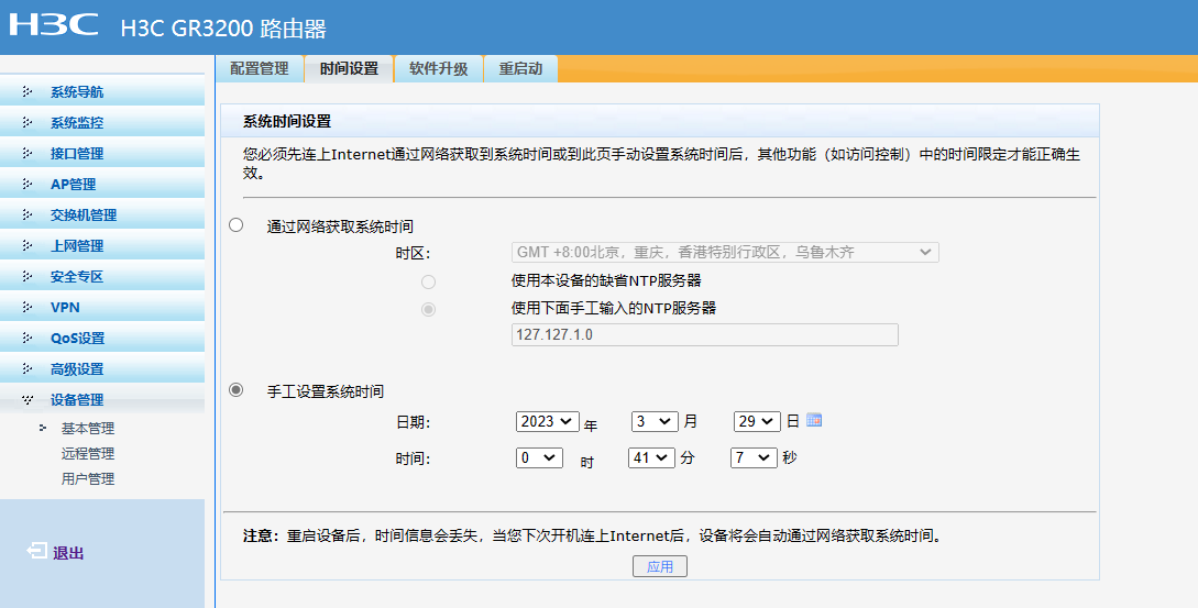 H3C GR3200 路由器(已作为AC管理器在用) 如何设置系统时间,无法设置自动获取时间,都是手动设置。只要断电重启,又是恢复到1970.1.1 时间,那位大神帮解决下。谢谢