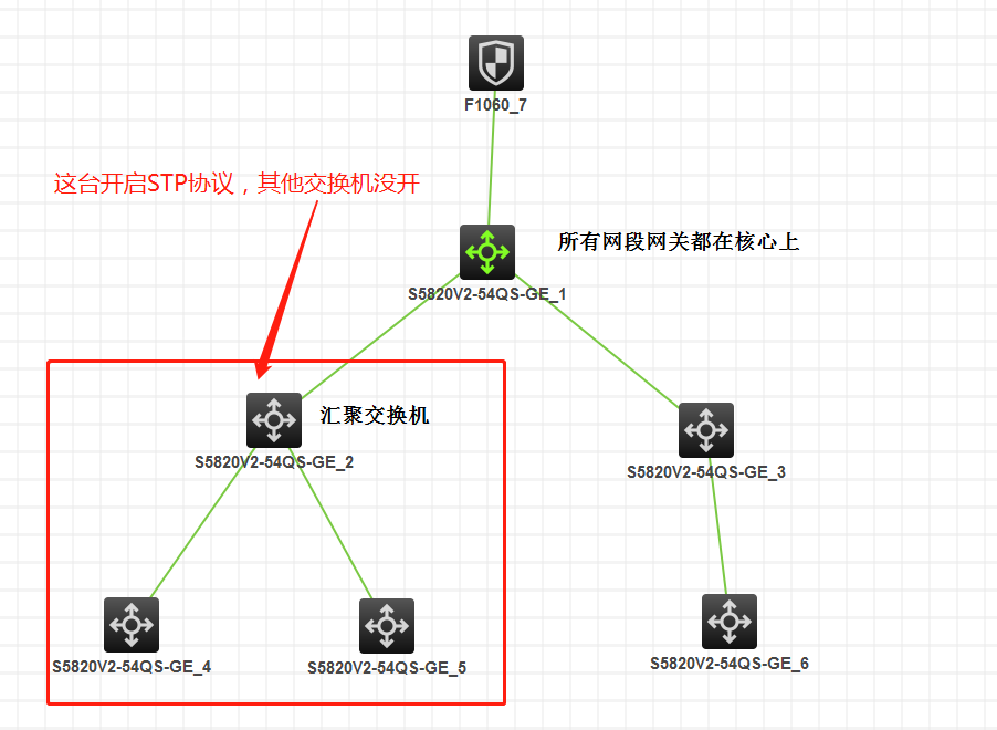 2.如下图网络拓扑:我在左边汇聚层这台交换机上开启了stp协议,其他的都没开,突然间这台核心以下全部断网,这是怎么回事。undo stp global enable又好了。