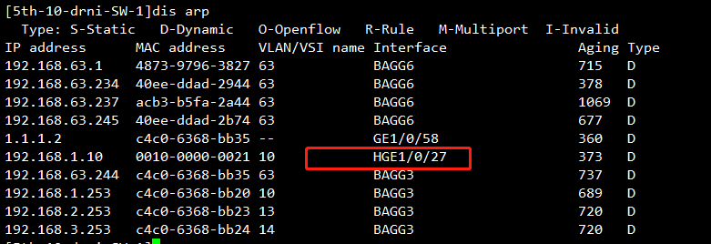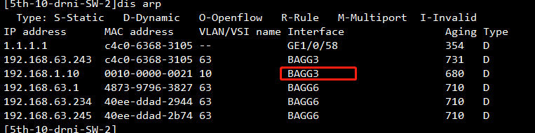 BAGG3是DRNI的IPP链路,HGE1/0/27是上联DR设备接口,两台交换机DR接口都是27口up的,为什么arp其中一台交换机是从IPP链路学的mac