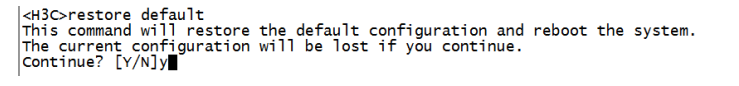 <H3C>提示进入设备命令行,命令行下输入:restore default命令并回车,再次输入Y确认后,路由器将恢复到出厂设置并重新启动,同时账号密码也恢复到初始配置,初始账号密码均为小写的admin