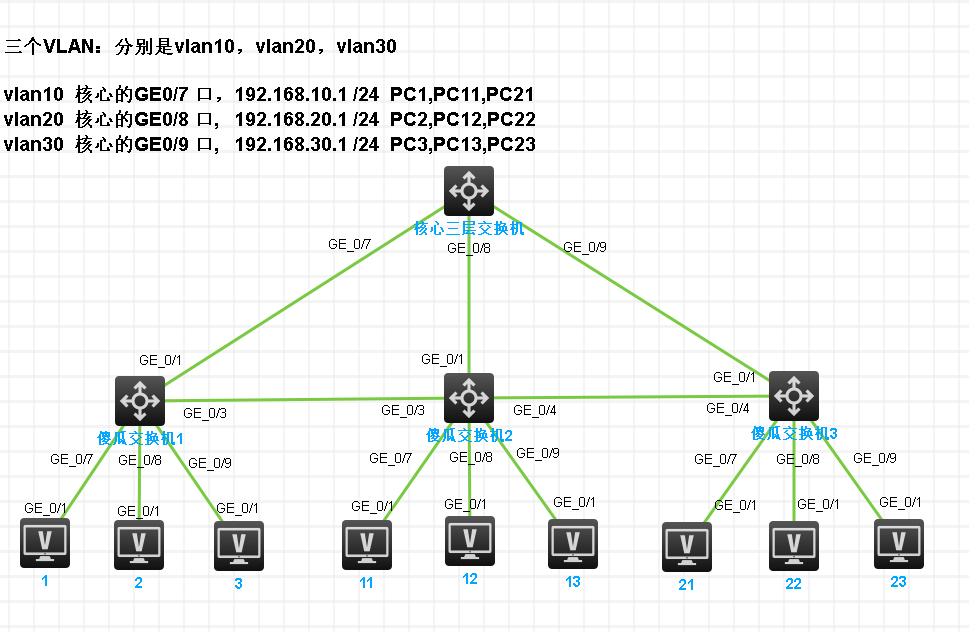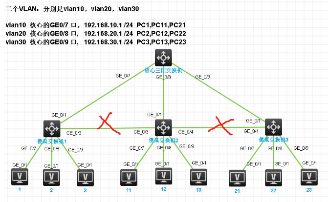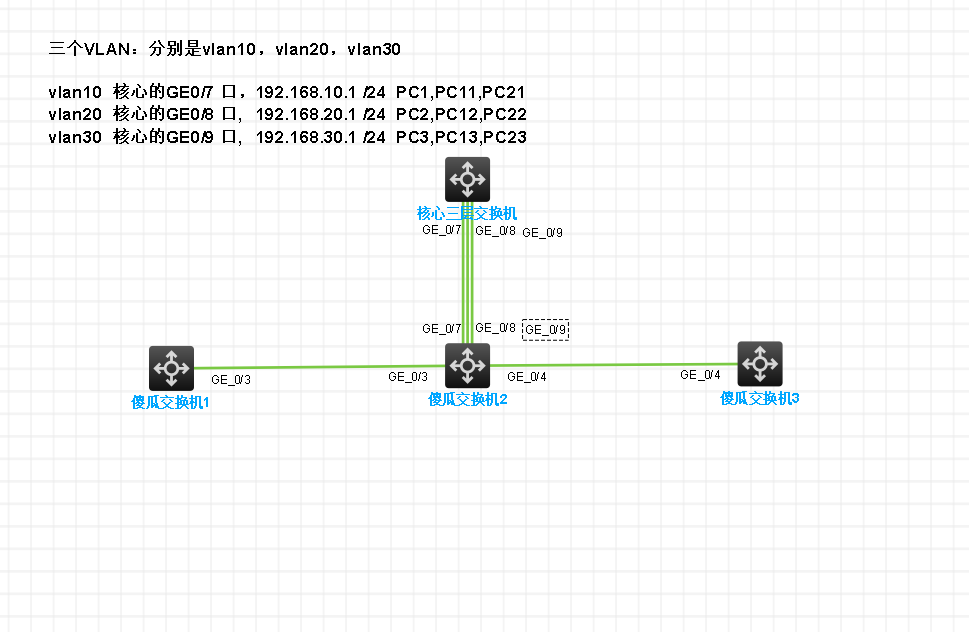 先说上面这个图,这图就是我后面给你说的vlan划分方式,1个接口划分一个vlan,不管这个接口下串联了多少台傻瓜机,他们都属于这一个vlan,你傻瓜机之间用线连接起来有什么作用呢?比如交换机1下面有一台pc1要访问pc3,明明arp广播只会在交换机1下泛洪,你连一根线到交换机2,3,这下好了,交换机2和交换机3也会泛洪,就失去广播域隔离效果了。