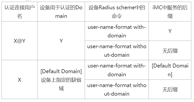 EAD认证按照这个表上的,需要认证时不带域的配置。案例里的都是带域的,如何配置连接用户名不带域的表格上的设备上指定缺省域如何配置?