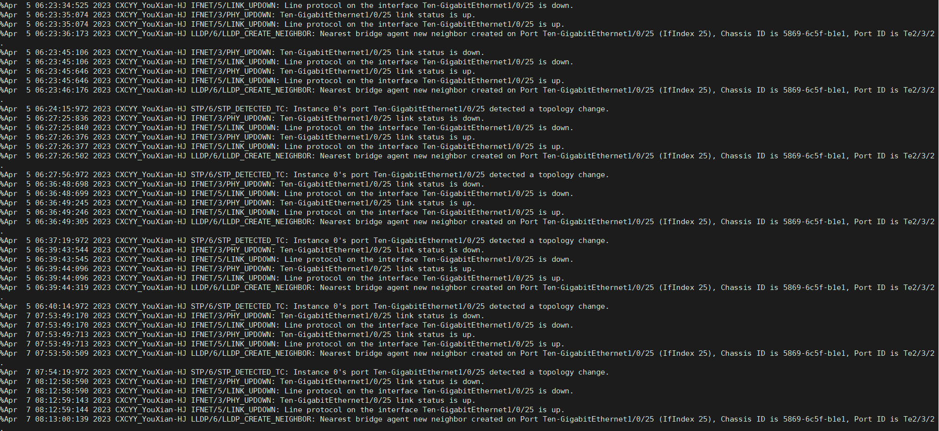 检查上面S5560的日志如下,其中25口连接核心N18K