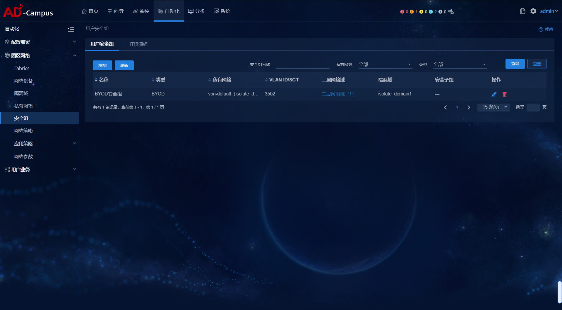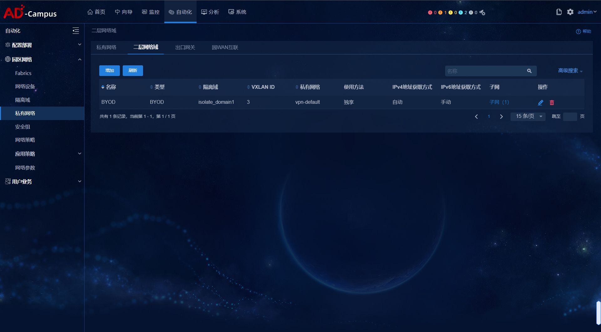 需要先创建BYOD的二层网络域和安全组,其中,“私有网络”必须选择“vpn-default”,“类型”选择“BYOD”,BYOD 地址池 租约默认为1 分钟,建议不要低于30s,可根据实际需求进行修改,BYOD 安全组必须选择我 司的DHCP 服务器vDHCP