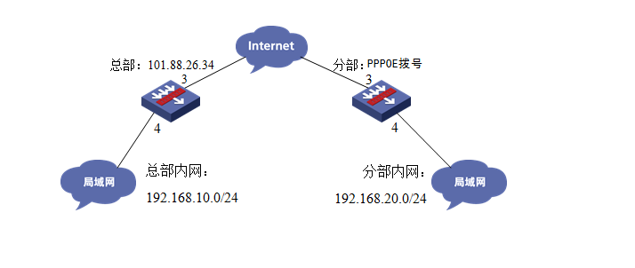 总部和分部各有一台防火墙部署在互联网出口,因业务需要两端内网需要通过VPN相互访问。IP地址及接口规划如下表所示:
