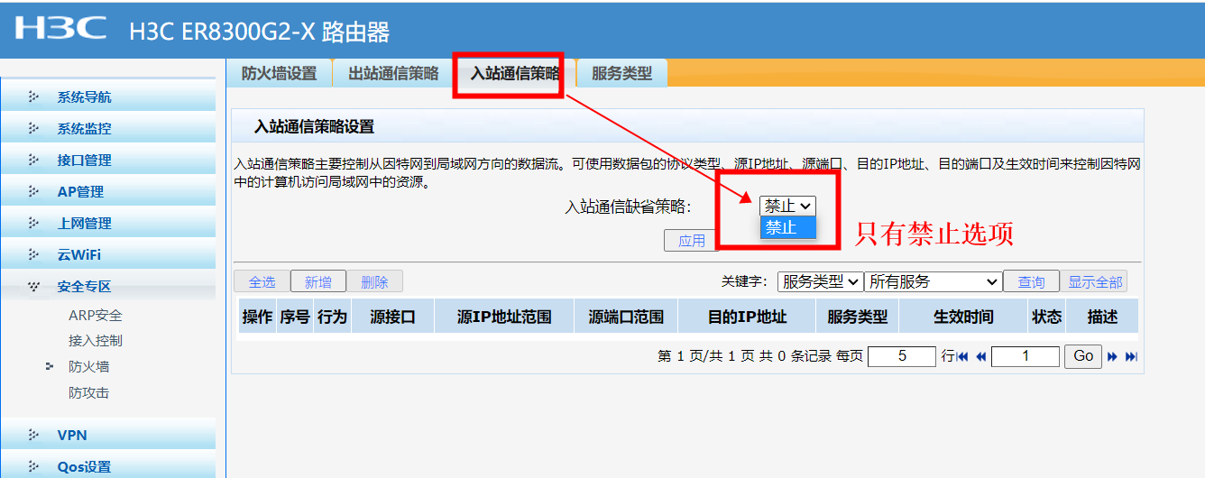 防火墙在开启nat地址转换功能后,防火墙入站缺省策略只有禁止的选项,有没有其他路由器型号推荐,支持两项缺省策略:禁止和允许。
