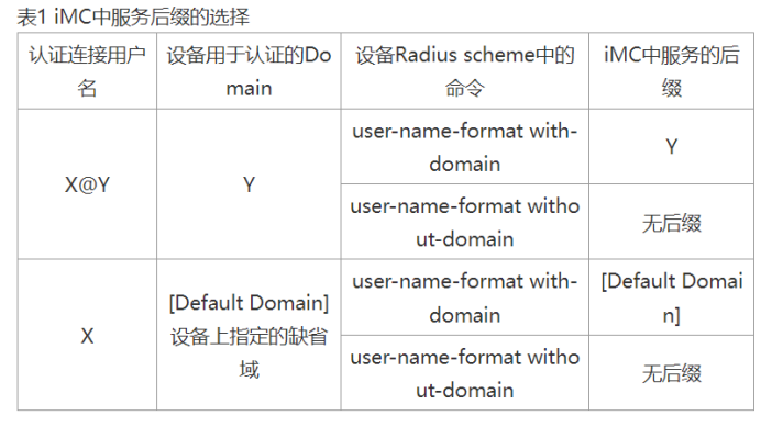 选的是认证连接用户名x,然后配置了缺省domain:domain default enable 域名,在接入设备上配置user-name-format with-domain然后再imc上配置服务后缀域名,但认证时提示用户未申请该服务如果后面加@域名认证就可以成功,imc上是有勾选服务的,如果配置user-name-format without-domain然后imc侧配置没写后缀认证就可以成功。