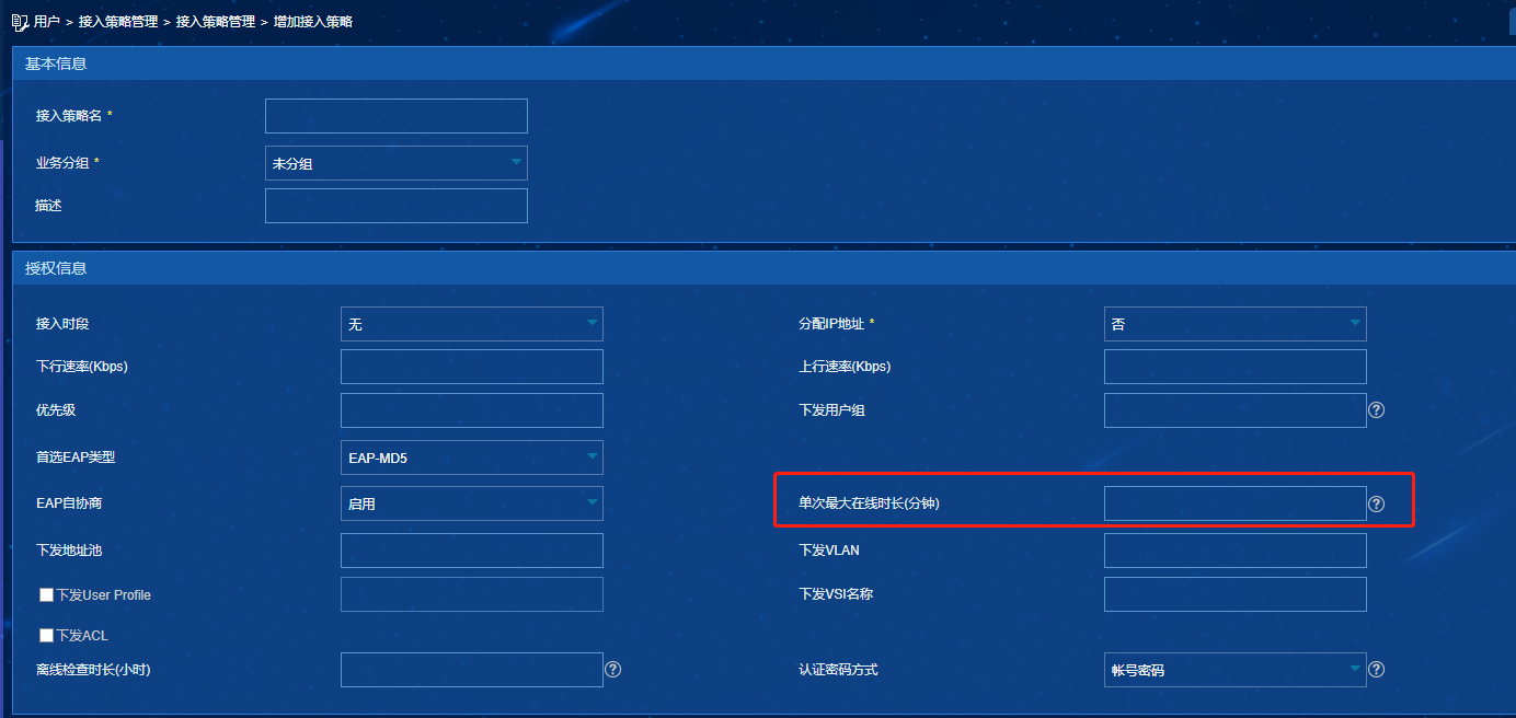 IMC EIA 如何设置一个用户在线的最大时长,比如限制用户最大允许连续在线时长为24小时,超时后将用户踢下线