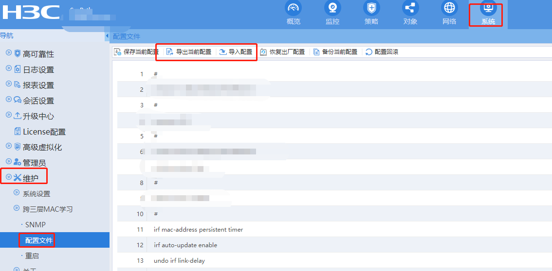 SecPath F1000-AK109 WEB管理 如何导出和导入配置,只找到了“保存”按钮,没有找到配置 “导出”、“导入”,“恢复配置”的功能,请问具体在哪里?