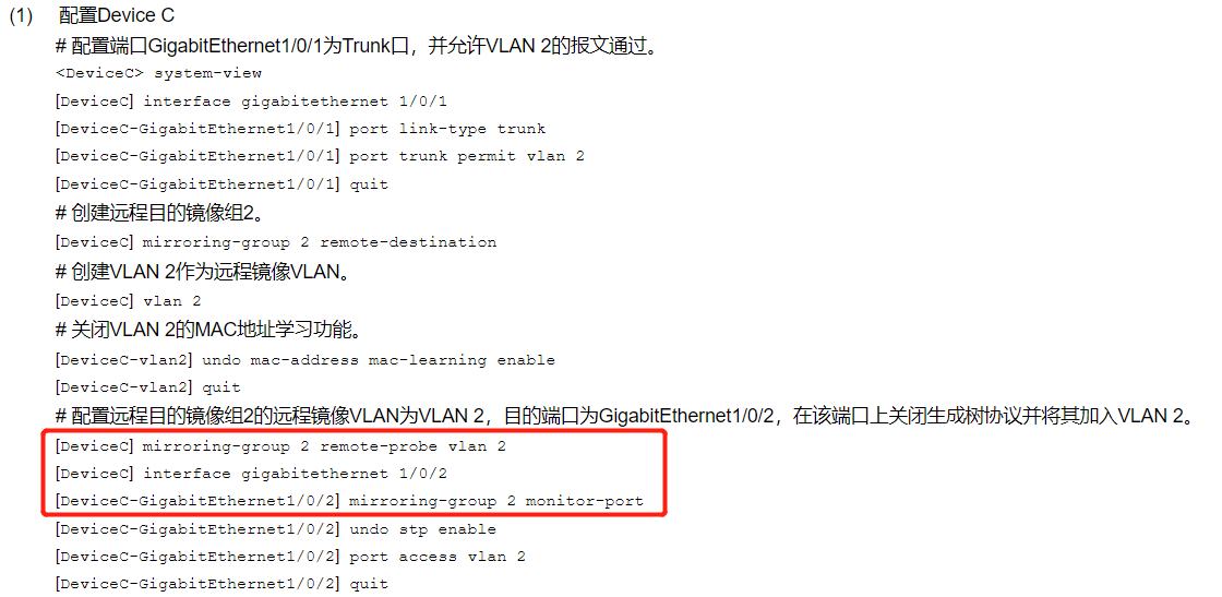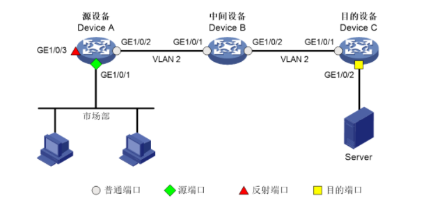 如图,要将A设备的G1/0/1口数据镜像到C设备G1/0/2口,在A设备上创建反射端口将数据镜像到vlan2,关闭mac学习功能,在设备B和C都透传vlan2,同样关闭mac学习功能,然后在设备C的G1/0/2口只配置port access vlan 2按道理就可以将数据广播到server上了,为什么官网上的配置,在设备C上还需要做镜像功能的配置,不配是否可以,什么原理了?如下: