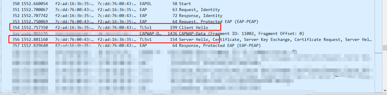 wifi认证过程中,只有Client Hello报文,但没有Server Hello报文,第一张图为正常AP的报文,第二张为故障AP的报文;