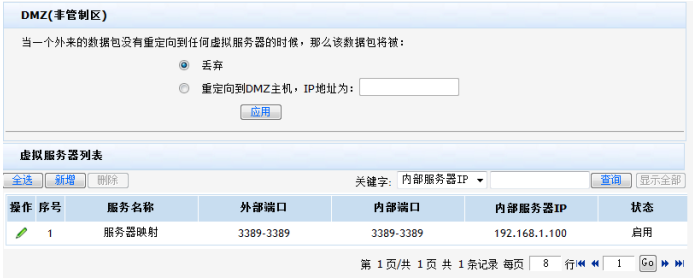 设置当虚拟服务器列表中如果不存在对应的映射项时,对报文的处理方式(主页面。选择“丢弃”或“重定向到DMZ主机”,单击<应用>按钮生效) | |