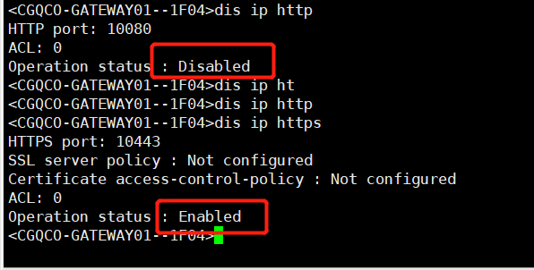 dis ip http,dis ip https查看端口和状态是否开启,disabled 是禁用 port 后是端口号