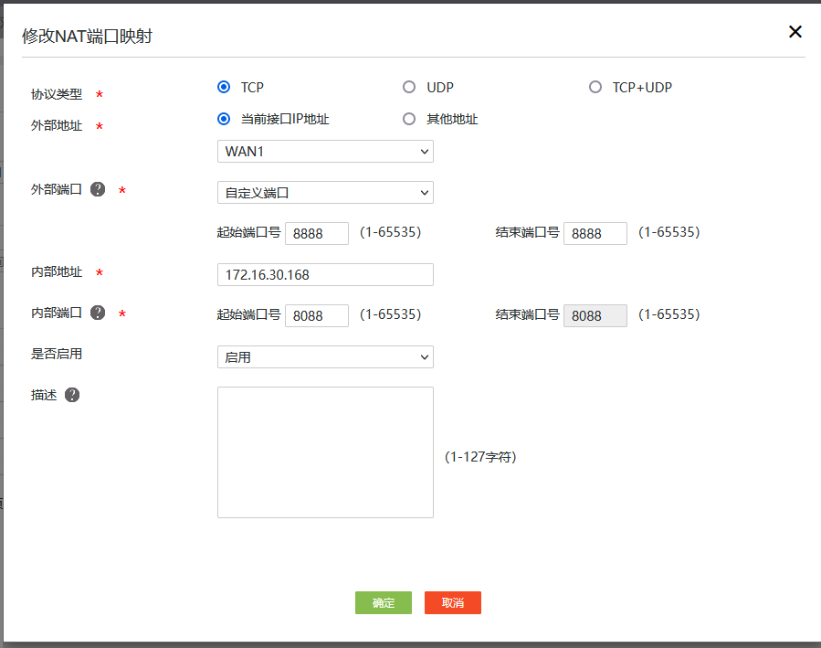 (1) 确认运营商是否屏蔽了端口 建议联系运营商确认指定的外部端口是否可用或者将映射的外部端口更换为其它端口,方法如 下: 7 在设备 Web 管理界面的导航栏中选择“网络设置>NAT 配置”,在“虚拟服务器”页签中点 击 NAT 端口映射列表中指定端口映射对应的修改图标,在修改端口配置对话框中,更改外部 端口的起始端口号和结束端口号,点击<确定>按钮完成配置。 如果更换外部端口号还是不能正常访问,则请按下面的步骤继续排查。
