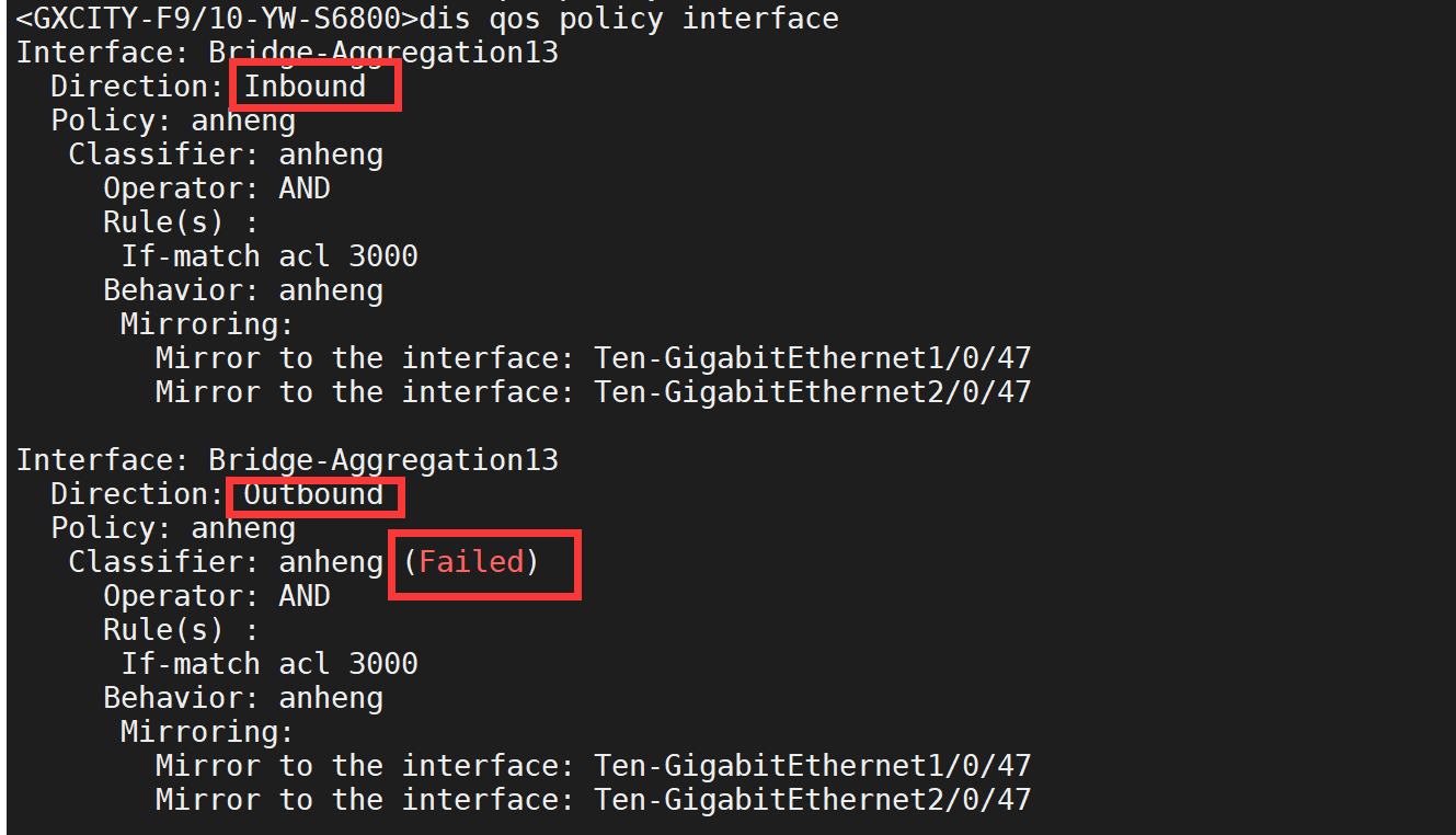 为什么接口的qos只能配置inbound呢,那岂不是出方向的流量不能镜像呀,我看了下日志,说是交换机不支持配置outbound