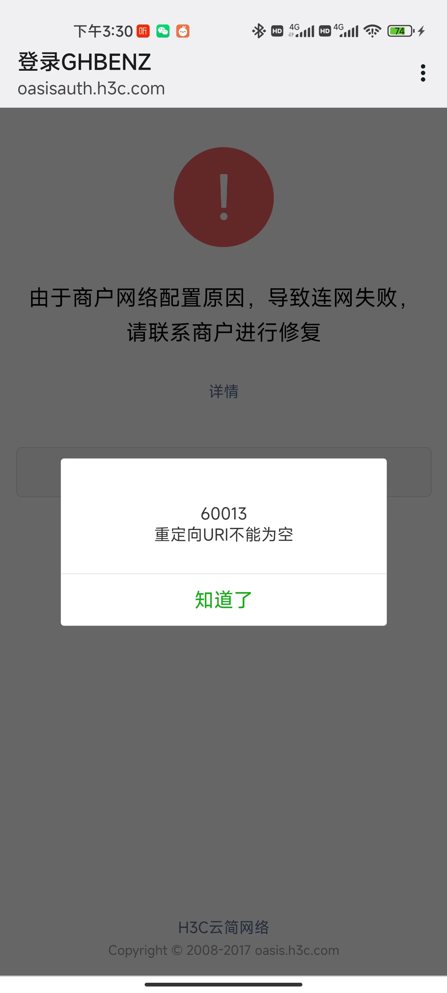配置到短信认证后,在终端点开认证页面显示由于商户网路配置原因,导致连网失败,代码60013 重定向URL不能为空。请各位帮忙解决下,谢了。