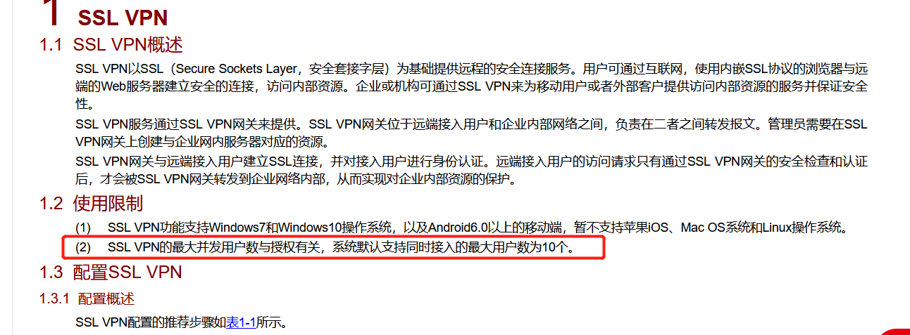 SSL VPN的最大并发用户数与授权有关,系统默认支持同时接入的最大用户数为10个。