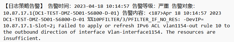 原因一:当前设备已达到 ACL 资源上限,请使用 display qos-acl resource 命令查看 acl 资源是否用尽,若用尽,请删除无用的 ACL 规则、QoS 策略、策略路由等无关业务确保设备有足够的内存进行 ACL 新增。