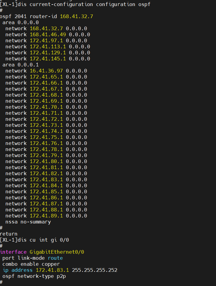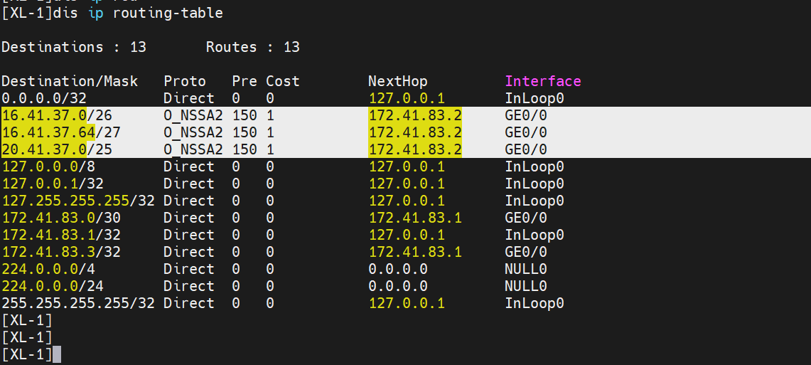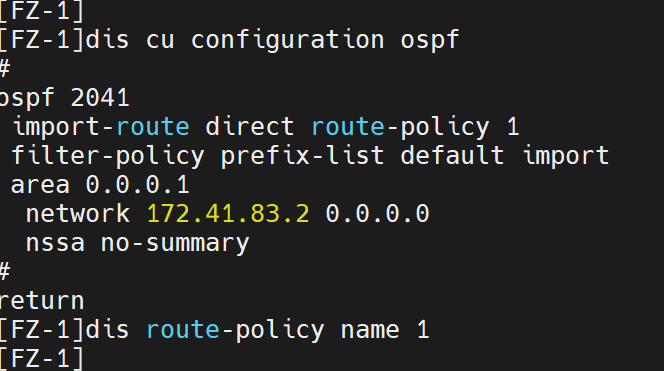 此时在分支路由器的ospf引入直连路由时,调用了一个不存在的route-policy,但在上联路由器上却可以查到分支路由器的直连路由条目