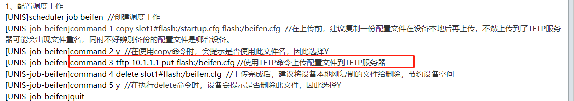 [SW1] schedule save-configuration to sftp-server configuration.cfg sftp 10.1.1.1 username admin password H3c123456 /config/