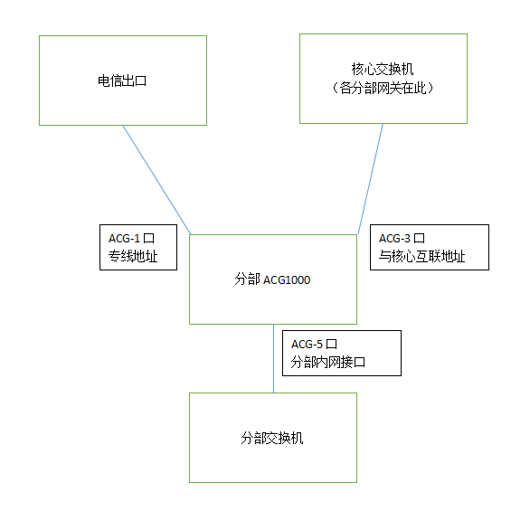 应该是把 各办公终端的网关放在你的ACG1000是上,这样的话使用策略路由,或者是静态路由也可以,默认的指向互联网,明细的指到核心交换机