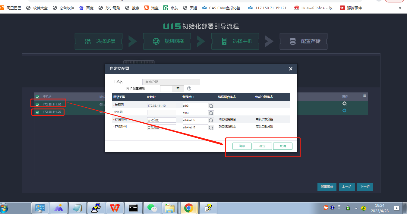 两个节点,其中172.88.111.10这个节点在选择主机并为主机管理、业务、存储内外网选择不同的物理端口后点击“确定键”时发现“确定键”为灰色无法点击。而另一个172.88.111.20节点可以点击确定键。