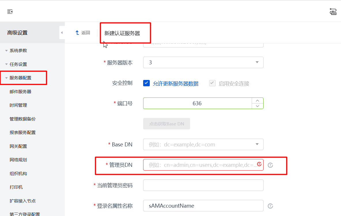 域用户需要使用WS客户端上的修改密码功能,使用636端口连接AD域控,询问管理员账号在AD中的权限属性(我知道至少需要有读取权限,帮助文档内没有说明)