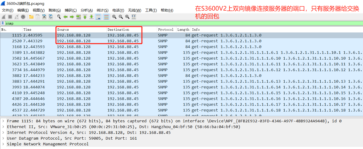 在网管软件使用snmp协议监控S3600V2,再在S3600V2上开启一个与服务器连接端口的双向镜像口,然后在镜像口抓包,只能抓到网管电脑给交换机的snmp包,抓不到交换机发给网管软件的snmp包,不知道是不是固件版本的问题。
