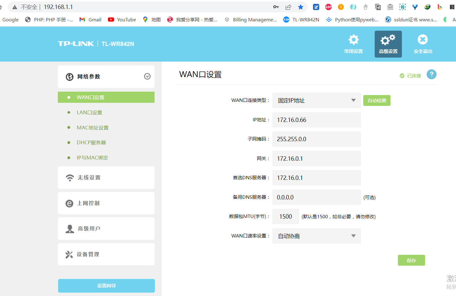 我的tplink路由器没有nat的设置功能,但我在tplink路由中查看静态路由的信息如下: 192.168.1.0 255.255.255.0 192.168.1.1 LAN/WLAN 172.16.0.0 255.255.0.0 172.16.0.66 WAN 0.0.0.0 0.0.0.0 172.16.0.1 WAN