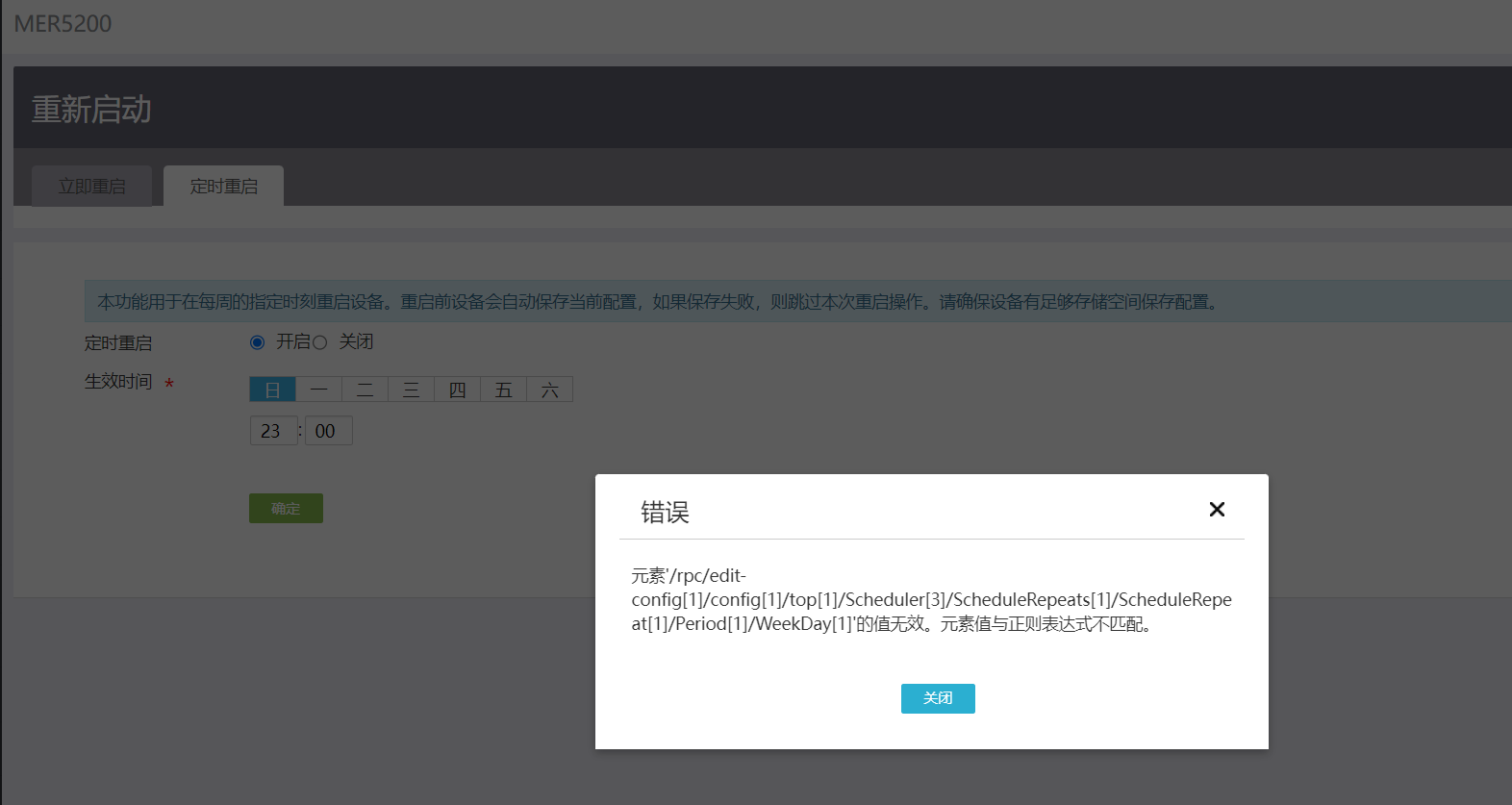 元素'/rpc/edit-config[1]/config[1]/top[1]/Scheduler[3]/ScheduleRepeats[1]/ScheduleRepeat[1]/Period[1]/WeekDay[1]'的值无效。元素值与正则表达式不匹配。