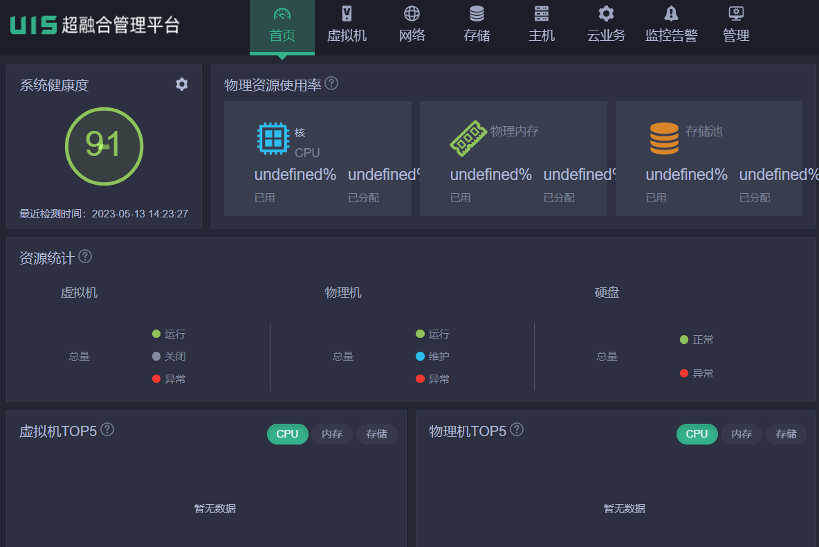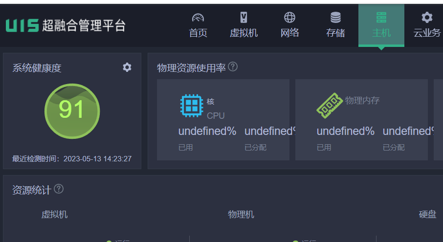 UIS计算虚拟化场景从E0707版本升级到E0750P09打开管理界面不显示主机和虚拟机等信息,点击主机与虚拟机选项没有反应,浏览器缓存也清理过了