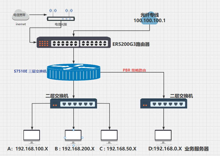 ER5200G3配置静态路由192.168.100.x,192.168.200.x,192.168.50.x指向S7510E上的互联地址 。
