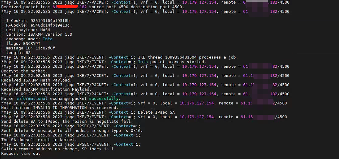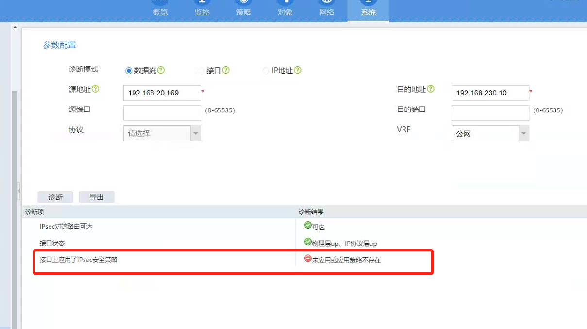 各位大佬们,防火墙PPPOE拨号上网,配置IPSEC后二阶段无法正常建立,一阶段IKE SA是成功了建立了得,并且状态是RD状态,在防火墙诊断中心诊断IPSEC提示如下图,请问各位大佬们是什么问题导致得呢,拨号配置中是引用了IPSEC策略得,策略名称也正常,二阶段报错日志也如下