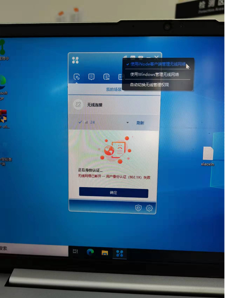 我知道windows自带的连接wifi功能是可以使用的,但是现在客户想使用一个软件,我就找到了这个iNode。我在使用iNode时,psk密码登录是可以的,但是802.1x就显示报错:无线网络已断开--用户身份认证(802.1x)失败。但是这个账号是可以正常登录radius认证的。
