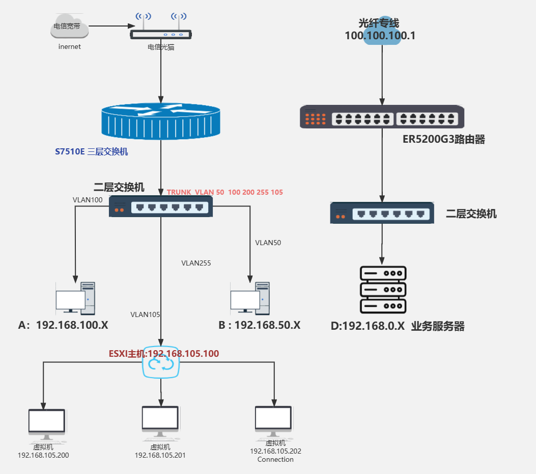 组成局域网后 D 仍然使用专线连接互联网, A B 走电信宽带网络,C主机 ( ESXI ) 中 虚拟机需要利用专线发布Horizon 云桌面