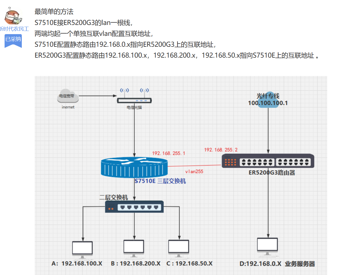 但是具体配置时发现三层交换机的VLan255 和 路由器的VLan 255 是同名的同网段vlan,他们的vlan接口 都在192.168.255.X 网段内,疑惑这里具体应该如何让配置,