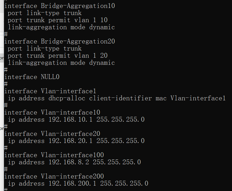 链路聚合配置好后,vlan10能获取10段地址,vlan20就没法获取地址,反之vlan20能获取20段地址,vlan10就获取不了10地址。