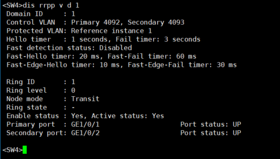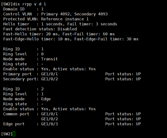ring 1 node-mode master primary-port GigabitEthernet1/0/1 secondary-port GigabitEthernet1/0/2 level 0