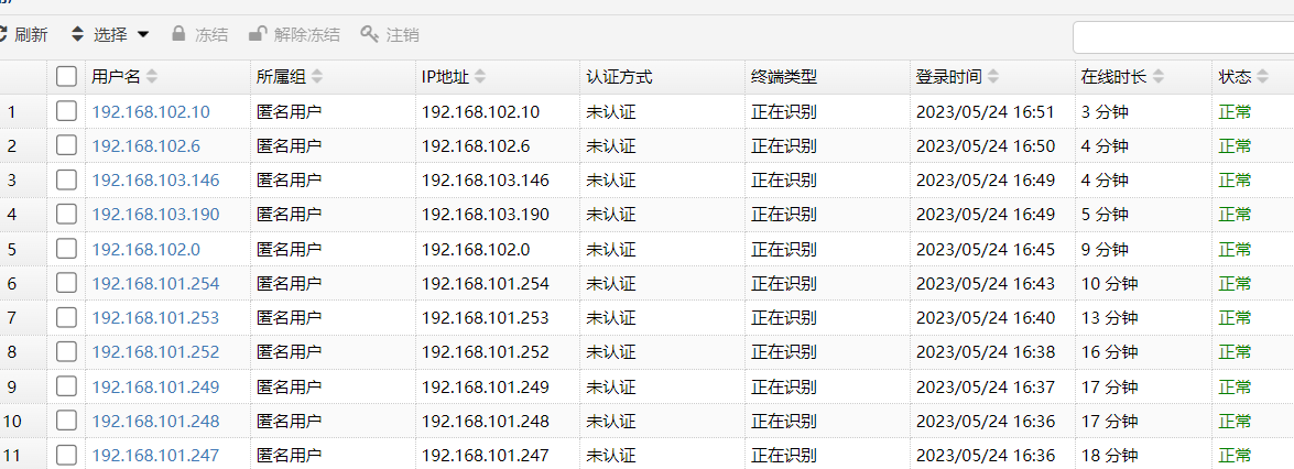 如果设置了认证,则这些用户为未认证用户和不用认证的用户,配置认证策略未认证用户虽然显示上线但应该上不了网的