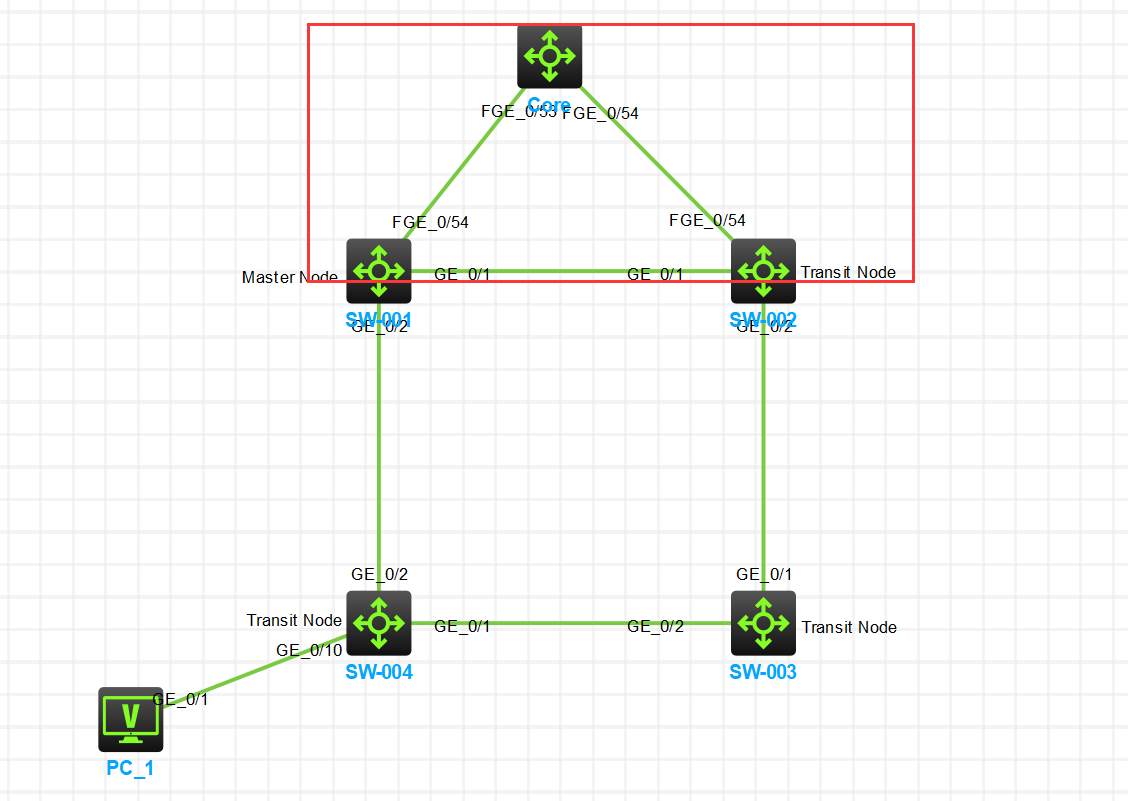 核心交换机上各拉一根网线trunk口到环网接入交换机的 master和Transit 节点上出现环路。