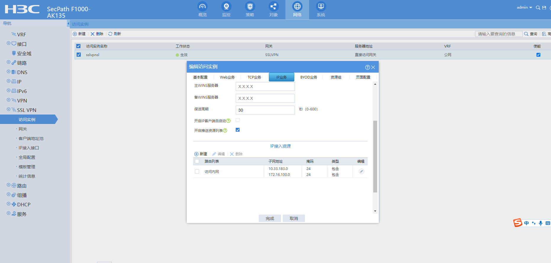 F1000-AK135 SSLVPN客户端连接后,资源无法访问。