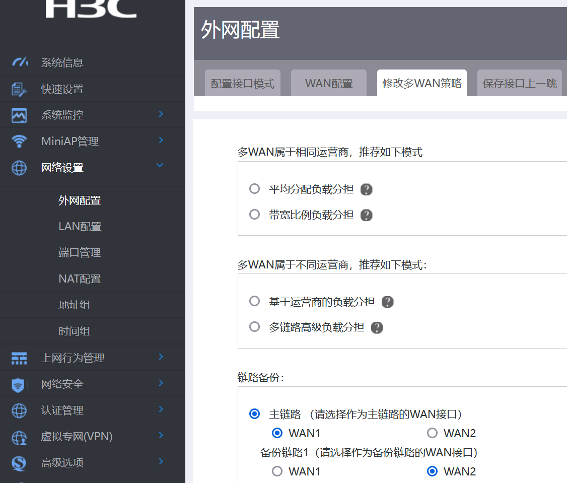 一台ER5200G3的路由器。WAN1口接普通互联网,WAN2口接专网(也能访问互联网,但带宽很小),专网用途访问10.x.x.x网段的网站。目前的设置是在静态路由下加了一条目的地址10.x.x.x,下一跳为专网的网关。 怎样设置路由,使访问普通互联网只能从WAN1口出,访问专网从WAN2口出,WAN2口不参与互联网流量。 注:老版本的ER5200G2路由器就可以在“多wan口工作模式”下将缺省流量比例设置成1:0即可实现。但ER5200G3就不能这样设置。那么在WAN1口互联网中断的情况下,WAN2口就会自动参与互联网流量。