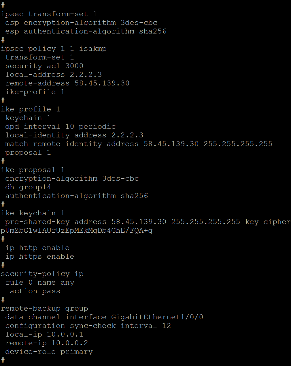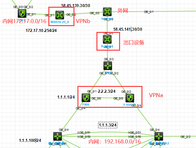 1.参考知了社区《RBM+VRRP组网下IPSec典型配置案例》做了以上实验,在出口设备58.45.141.30上做了nat,一对一映射内网2.2.2.3;