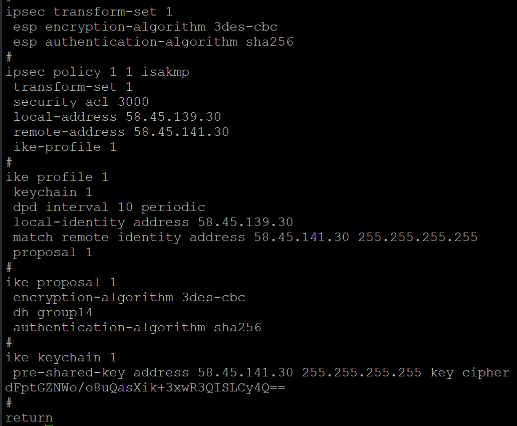 4、检查ipsec proposal(v5平台) /ipsec transform-set(v7平台)参数两端是否一致(封装模式、安全协议、验证算法、加密算法)