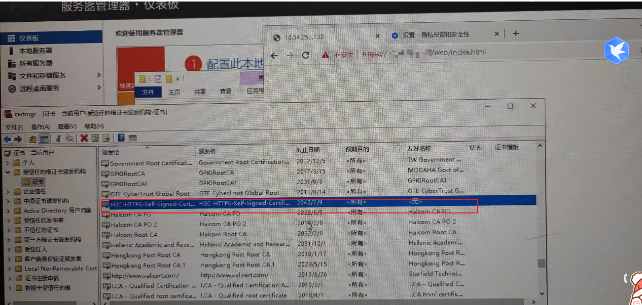 但是另外一台虚机,windows server 2008r2可以正常打开web,权限没问题的,我把这个网站导入到本地受信任的根证书颁发机构,还是证书问题打不开。