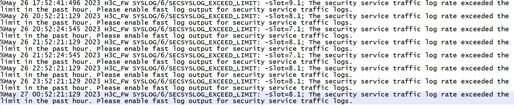 %Feb 7 11:29:02:015 2023 H3C SYSLOG/6/SECSYSLOG_EXCEED_LIMIT: The security service traffic log rate exceeded the limit in the past hour. Please enable fast log output for security service traffic logs.