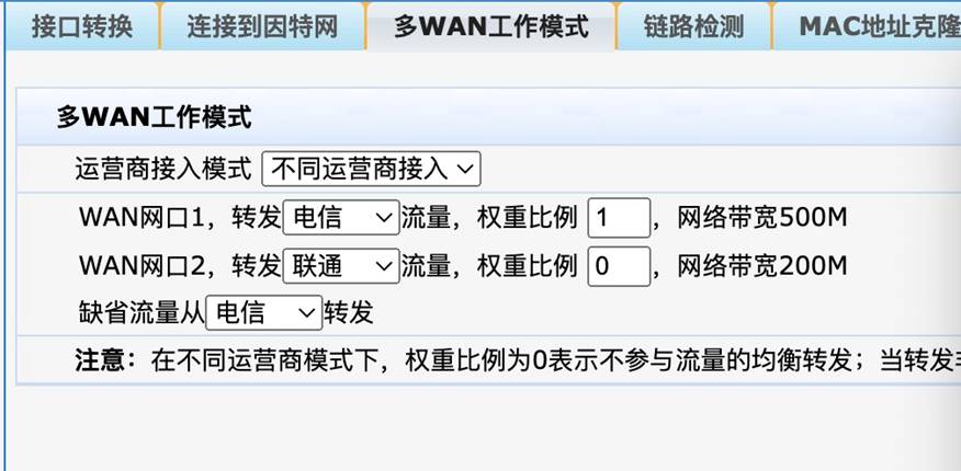 先介绍下背景,公司路由器为ER8300G2路由器,为500M电信和200M移动宽带两路接入的方式,静态ip为移动宽带固定ip。初步看下来,公司内所有的办公机和服务器的出口ip均为移动ip,怀疑电信的宽带虽然接入了,但是一直在闲置状态。