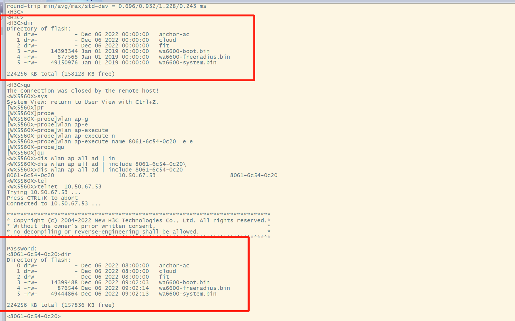 ap可以获取到地址,远程进入ap可以ping通ac,ap型号是WA6620X,同型号别的都可以上线,就这个不行,图中上面红圈里的是卡在IL状态下的ap版本信息,下面红圈里的是已经正常上线的ap版本信息,发现版本不一致,请问后续要怎么操作呢