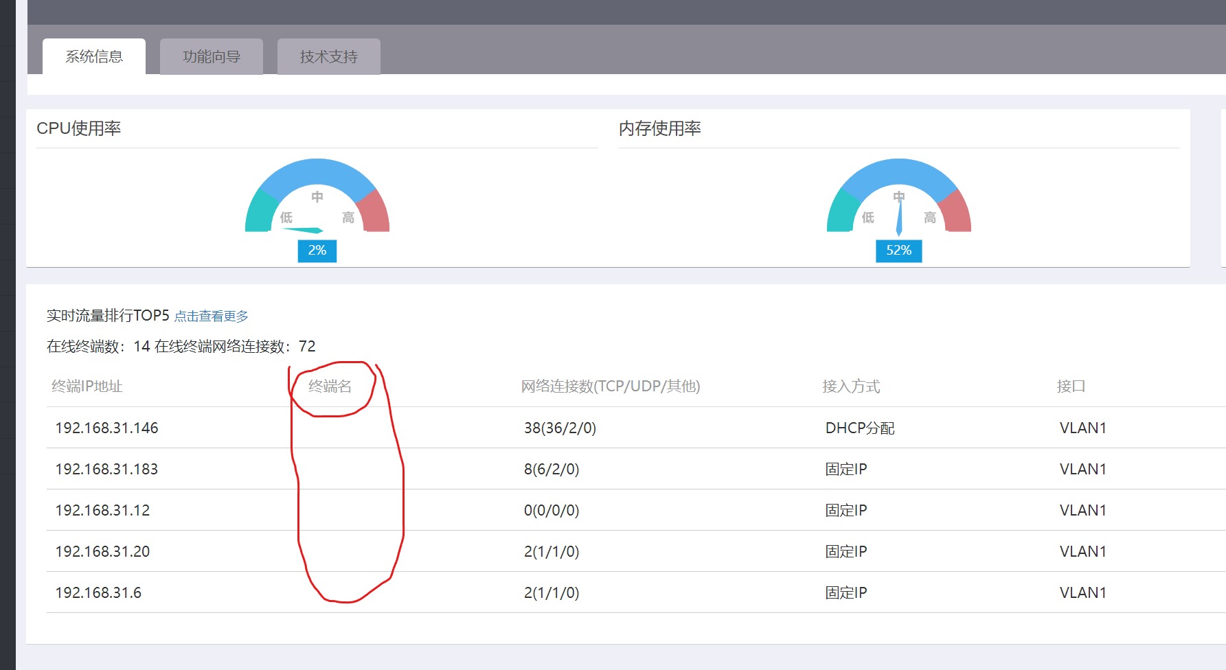 如图所示,只能看见已连接终端的ip地址,但是后面的终端名是空的,这要是大量的ip地址的话,很难分辨出某个ip对应的是哪台设备,能不能修改备注终端名?现在很多家用路由器都可以修改备注终端名。