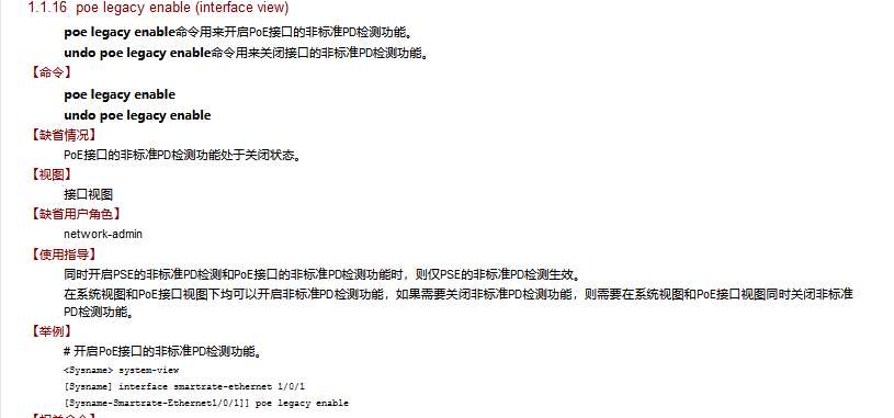 poe legacy enable命令用来开启PoE接口的非标准PD检测功能。